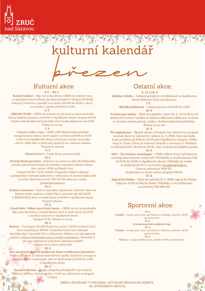 Kulturní kalendář Zruče nad Sázavou - březen 2026